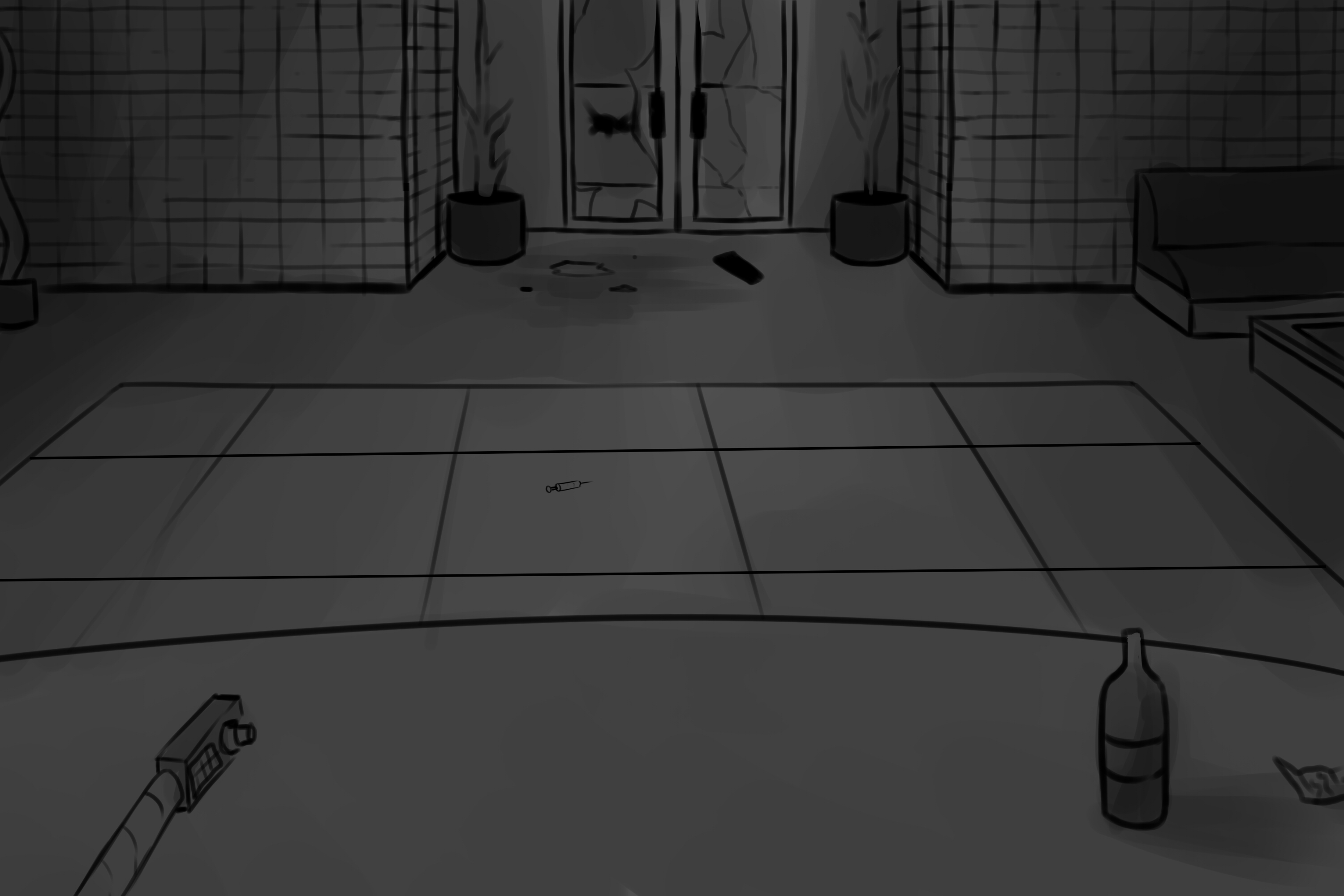 David steps inside the empty club. He squints his eyes through the darkness and can just barely make out the back wall. Chairs are over turned, bottles scattered in corners, and scratch marks litter the floor and walls. They're similar to the ones that were on the door- no surprise there.